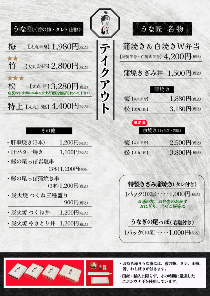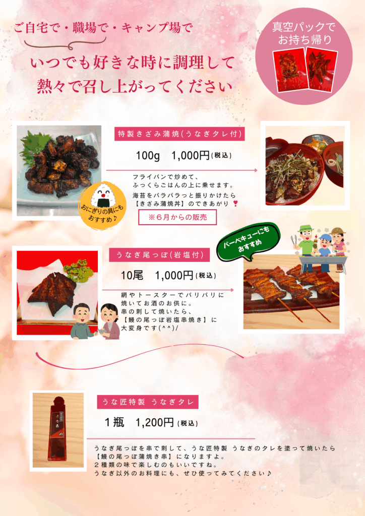 10個以上でのご注文は、 事前にご予約いただけますとスムーズ対応できます。 会議や研修会など、ご家庭でのお集まりにも、うな匠の味をお持ち帰りいただけます。