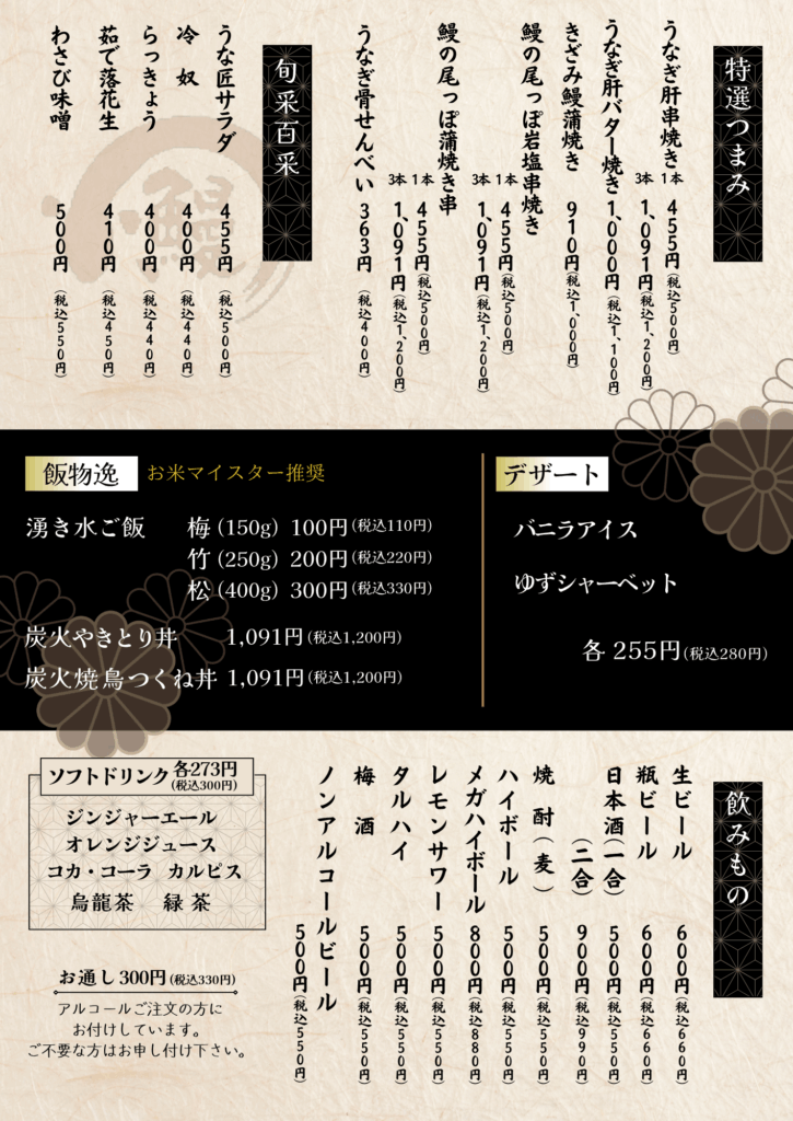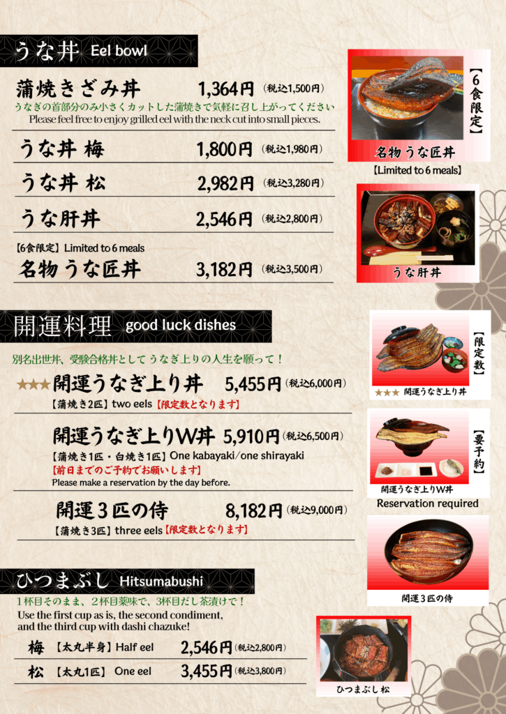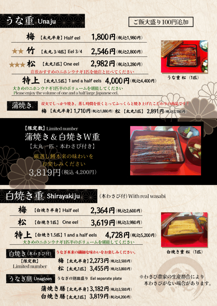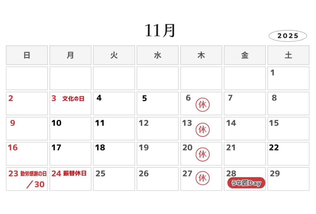 営業時間 | 11:00~14:00、17:00~20:00(LO 19:30) ※うなぎが無くなり次第、営業終了いたします。 ※営業時間・定休日は変更となる場合がございますので、ご来店前に店舗にご確認ください。 |